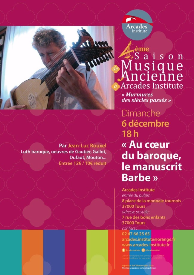 Présentation de programme de concert de musique française du XVIIe siècle pour luth, tiré du manuscrit Barbe ; avec comme compositeurs : Gautier, Gallot, Dufaux, Mouton, Edmon …